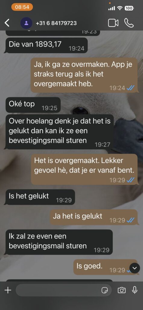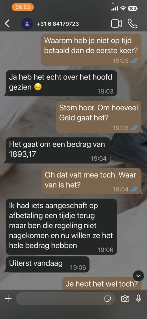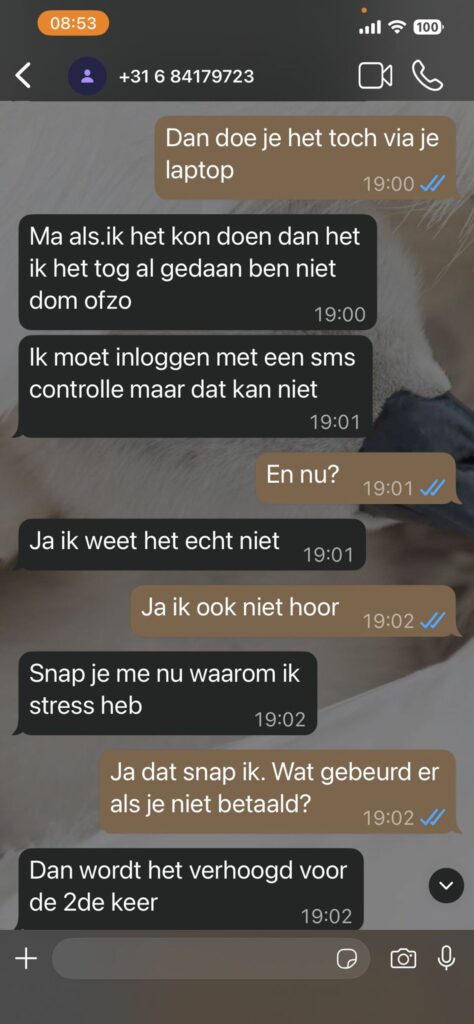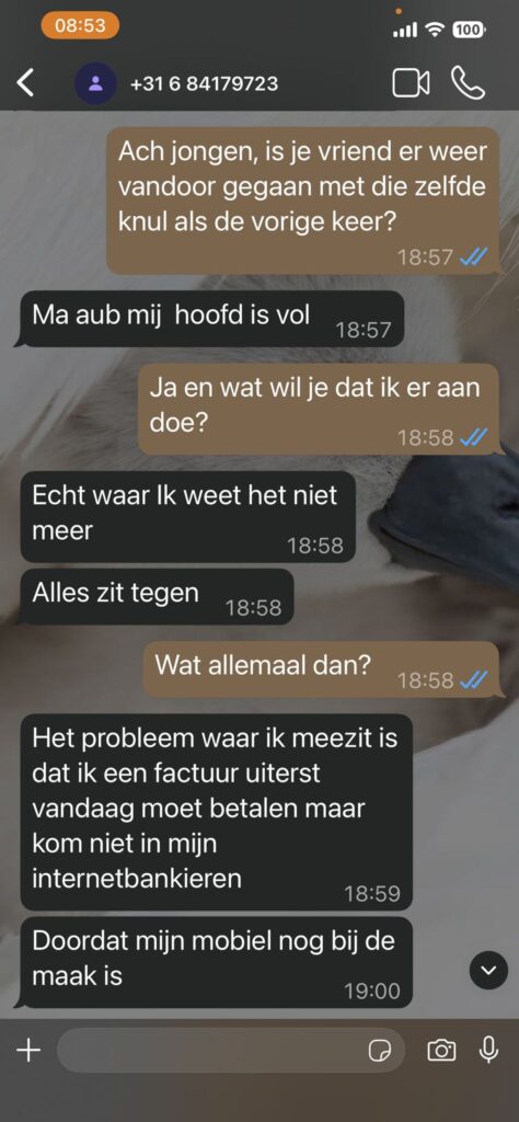 Niet veel later wordt het verhaal zwaarder aangezet. De Whatsapp oplichter klaagt over een kapotte mobiel, een leentoestel en mentale druk: “Ja echt veel stress hierdoor gekregen. Wordt er niet goed van.” Vervolgens komt het echte doel naar voren: geld. Er is zogenaamd een factuur die “uiterst vandaag” betaald moet worden, maar internetbankieren lukt niet door sms-controle. Het bedrag? “1893,17.”