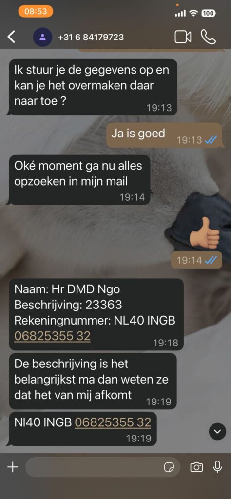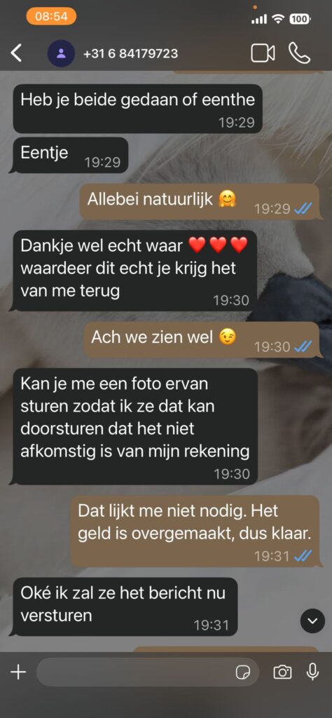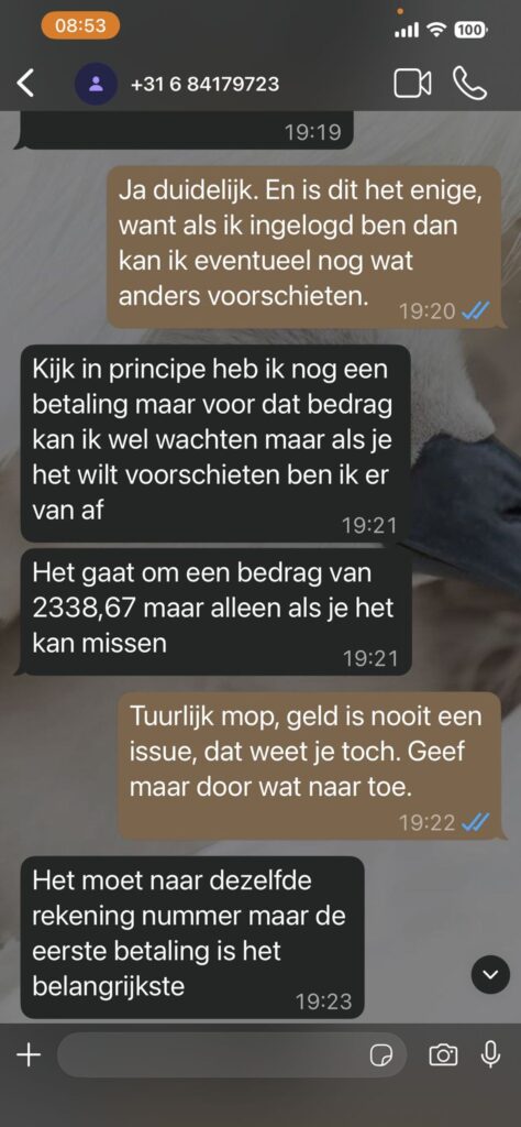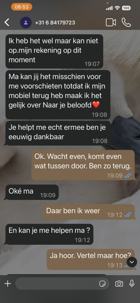 De oplichter speelt het slim door te zeggen: “Ma kan jij het misschien voor me voorschieten… je helpt me echt enorm ben je eeuwig dankbaar.” Alles is erop gericht om vertrouwen, schuldgevoel en haast te combineren – hét handelsmerk van een ervaren Whatsapp oplichter.