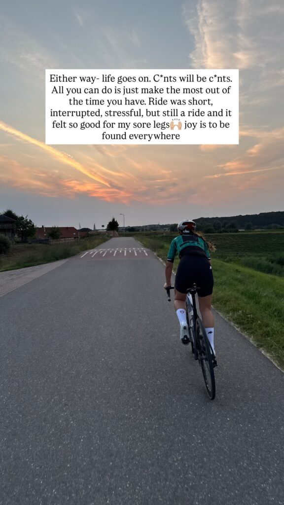 Ondanks alles probeert de 27-jarige wielrenster Puck Moonen positief te blijven. In haar Instagram-posts deelt ze niet alleen het voorval, maar ook haar persoonlijke reflectie. Ze noemt de rit stressvol en kort, maar wel waardevol: “It felt so good for my sore legs. Joy is to be found everywhere.”