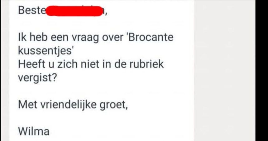 Een Marktplaatsverkoper werd onlangs flink aan de tand gevoeld door Wilma, die vond dat de brocante kussentjes niet in de juiste Marktplaats categorie stonden. Wilma vroeg meerdere keren of de verkoper zich niet had vergist bij het plaatsen van zijn advertentie. De verkoper legde rustig uit dat Marktplaats zelf deze categorie had voorgesteld en dat hij dat niet kon wijzigen.