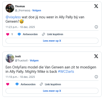 Op X en andere platforms werd massaal gereageerd. Fans noemden het “typisch WK Darts” en grapten erop los. Termen als ‘ouwe snoeperd’ vlogen voorbij, terwijl anderen het vooral amusant vonden dat de camera’s zo vaak richting het familievak draaiden. Dat Michael van Gerwen altijd al kon rekenen op veel aandacht, werd hiermee opnieuw bevestigd. Voor sommigen was het vooral entertainment, voor anderen een teken dat zijn leven naast de oche minstens zo interessant is als zijn spel erop.