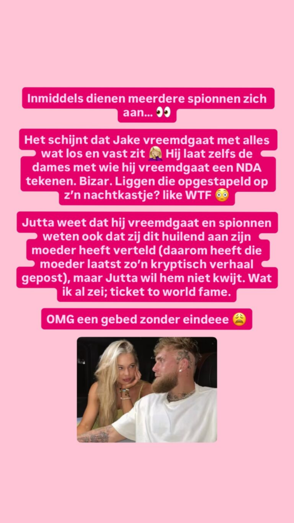 “Inmiddels dienen meerdere spionnen zich aan… 👀” “Het schijnt dat Jake vreemdgaat met alles wat los en vast zit 🤦♀️ Hij laat zelfs de dames met wie hij vreemdgaat een NDA tekenen. Bizar. Liggen die opgestapeld op z’n nachtkastje? like WTF 😳”
